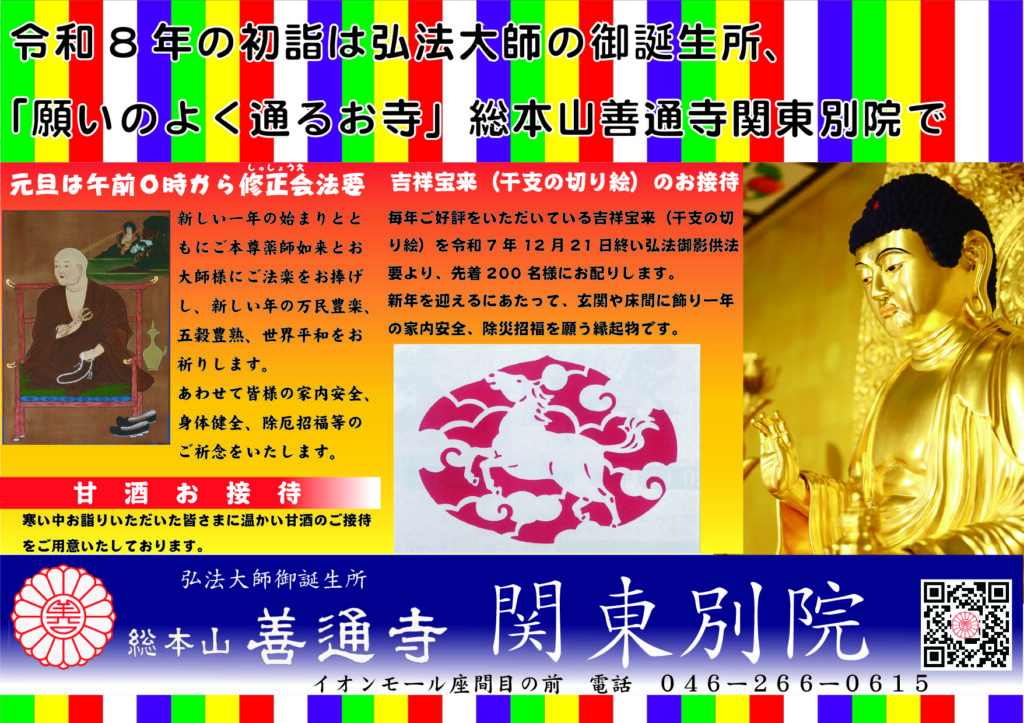 令和8年のお正月を迎える準備がだんだんと進んできました。元旦午前0時より、皆様のご健勝と平安、招福をお祈りする修正会法要を本堂にて執り行います。ぜひご参座ください。 境内では、十三種のおみくじが引けるおみくじコーナーを設け、また寒い中お詣りいただいた皆様に温かい甘酒のお接待をご用意してお待ちします。 なお、修正会法要の後、先着200名様に吉祥宝来(干支の切り絵)の授与を行います。