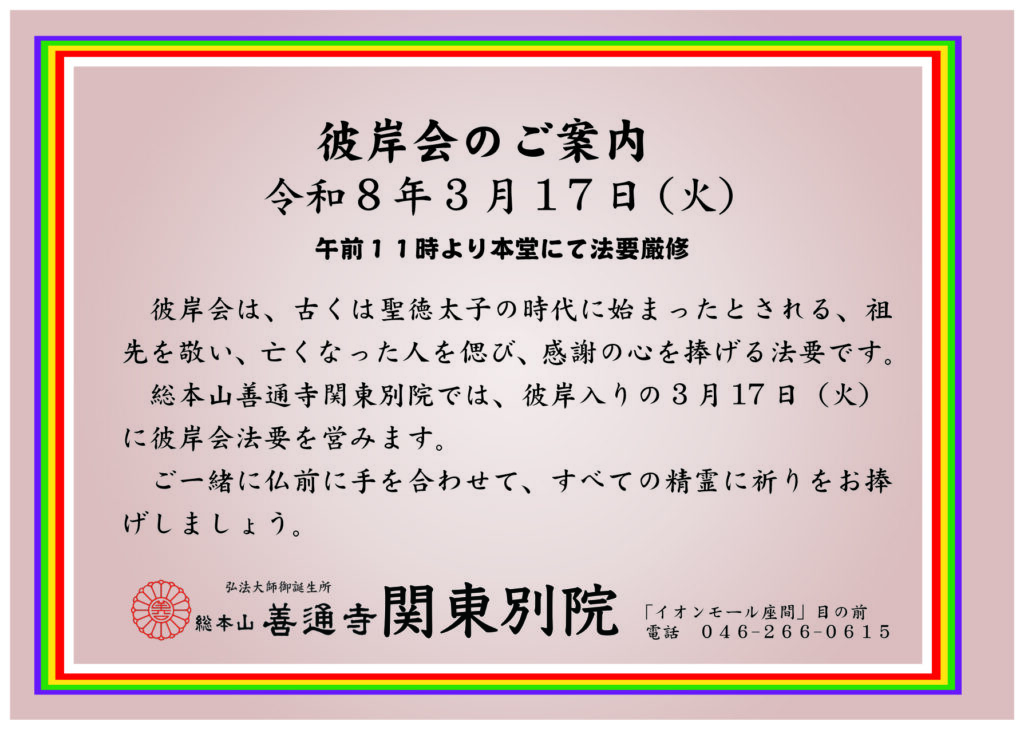 総本山善通寺関東別院では、彼岸入りの3月17日(火)に彼岸会法要を営みます。